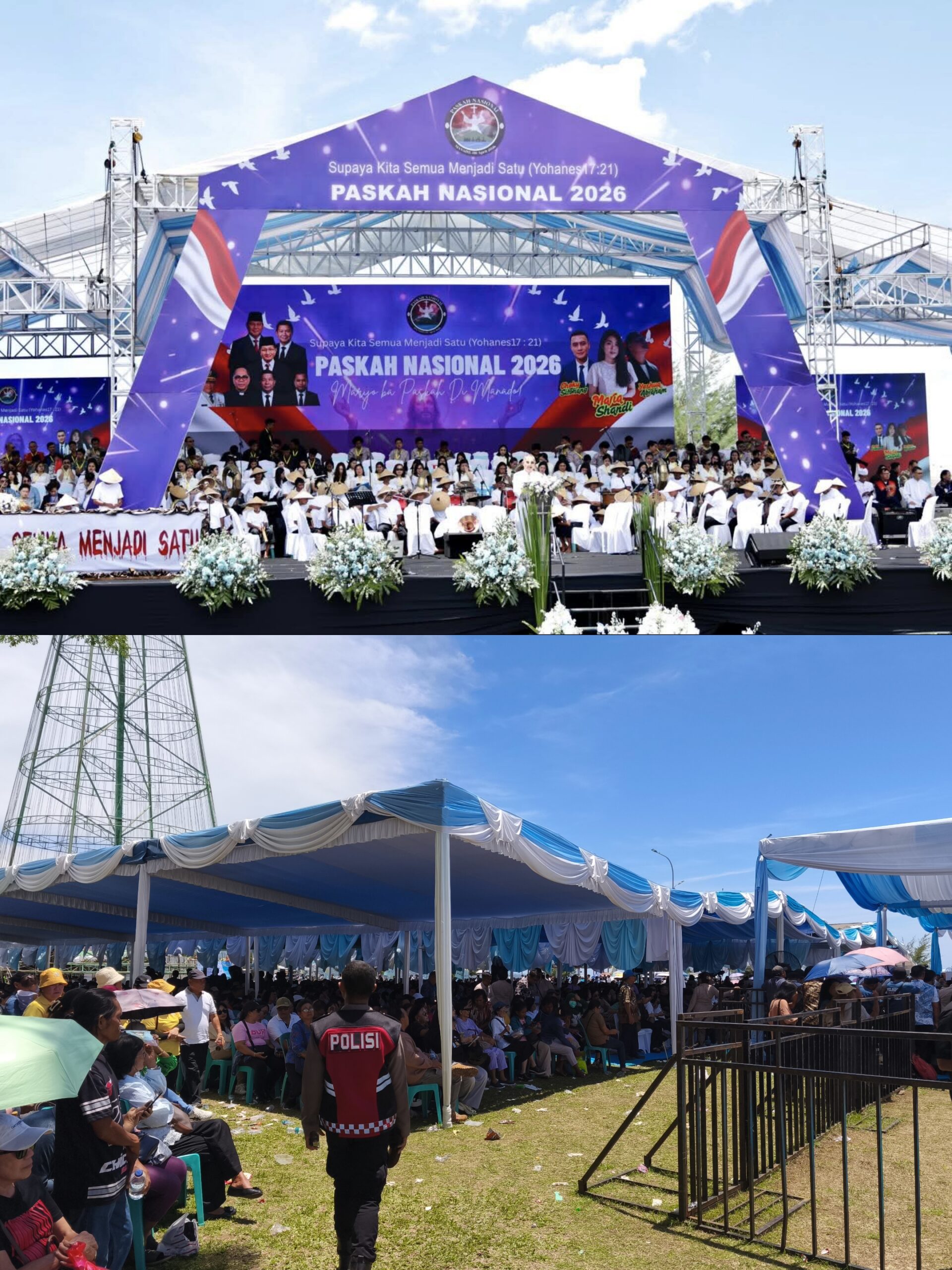 RagamSulut.co.id – Puluhan ribu jemaat memadati kawasan Pohon Kasih, Megamas, Manado, dalam rangka perayaan Ibadah Paskah Nasional 2026, Rabu (8/4/2026). Kegiatan ini mengusung tema “Supaya Kita Semua Menjadi Satu” yang diambil dari Yohanes 17:21.
